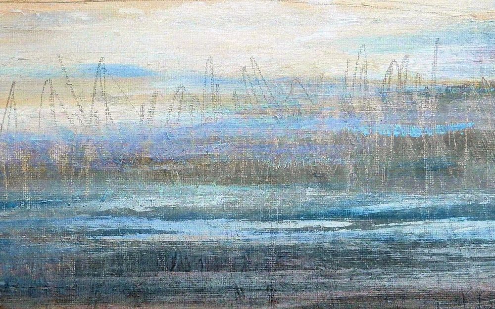 Horizontale und vertikale Farbflächen und Linien verbinden sich zu einem malerischen Raumambiente aus Land und Wasser in natürlichen Blau-, Weiß- und Sandtönen. Sanft gewellte Linien, sanft gewelltes Wasser.