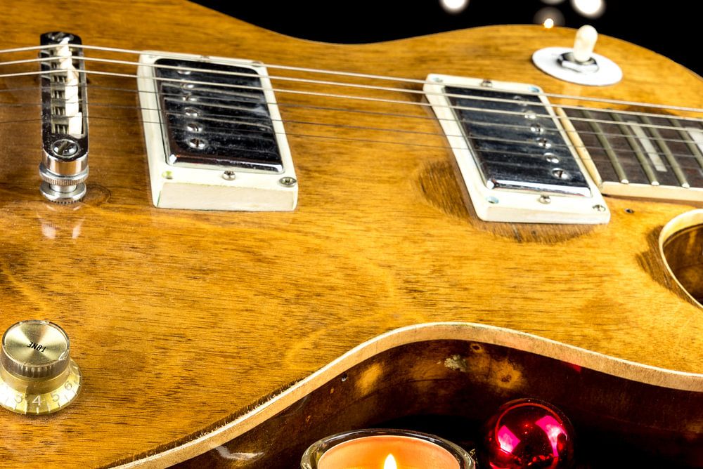 gitarre, christbaumkugel, teelicht, tannenzapfen, kerze, nuss, musiker, becher, kerzenlicht, zinn, schnaps, saiten, saiteninstrument, instrument, musik, weihnacht, rock musik, alkohol, musizieren, holz, trinken, advent, glänzend, dekoration, braun