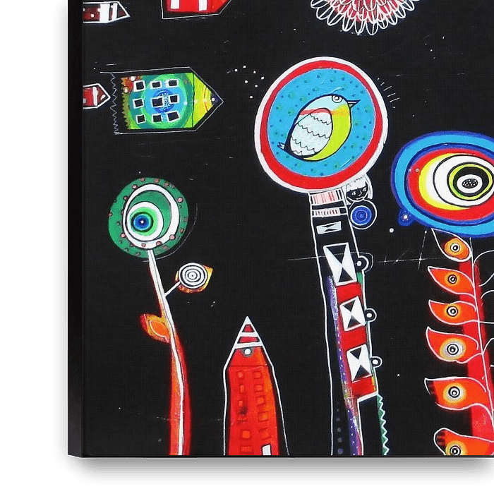E N J O Y Dieses intuitive Gemälde ist voller Farben und Freude. Kleine Häuser, kleine Vögel und organische, blumige Formen. Das Schwarz gibt einen schönen Kontrast zu den Farben. Es ist mein Lieblingsbild und das Original wurde bereits verkauft. Es hat auch an mehreren schönen Ausstellungen teilgenommen! Das Werk ist groß und wurde von…