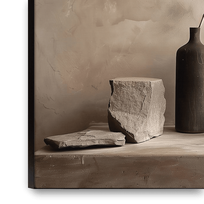 Bestelle dieses Japanische Kunst-Wandbild Earth & Elegance ein Stillleben mit dunkler Vase und Natursteinen von Dutch Art Works als Reproduktion auf Leinwand, Alu-Dibond, als Poster, Fototapete oder Acrylglasbild.