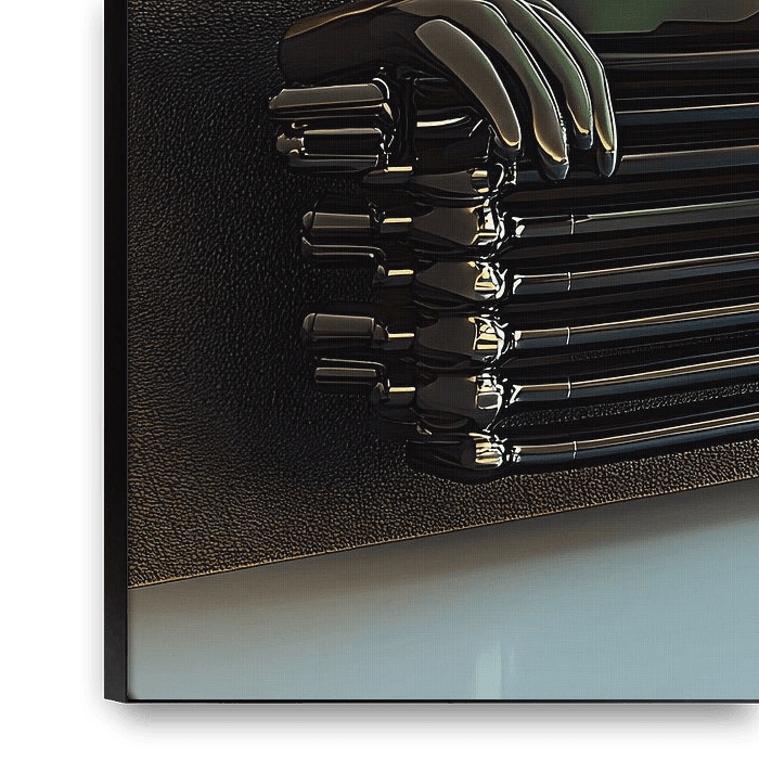 „Echo der Beobachter“ enthüllt eine schlanke, metallische humanoide Figur, die halb aus einer abstrakten, datenstrukturierten Wand hervortritt - ihr eindringlicher, nachdenklicher Blick ist nach vorne gerichtet, während sie ein Bündel hochleitfähiger Stäbe umklammert, die an technologische Antennen oder verschlüsselte Schriftrollen…