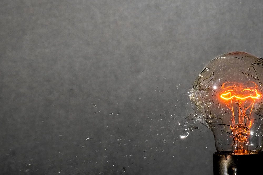 Glühbirne, die von einer Patronenkugel getroffen in Scherben explodiert