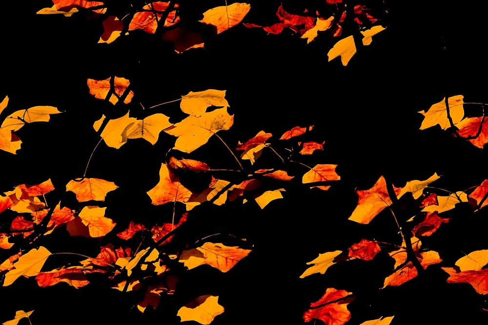 Die Sonne fällt auf einen Baumzweig mit bunten Herbstblättern. Das Gegenlicht lässt die Blätter aussehen, als würden sie in einer Formation durch die Luft fliegen. Ein stimmungsvolles, fast abstraktes Bild.