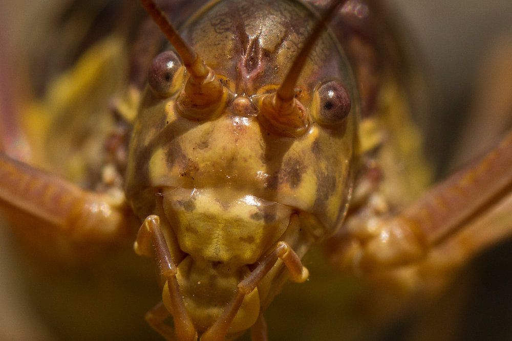Een bruine sprinkhaan met een kop als een schedel met grote ogen en een bek vol tanden
