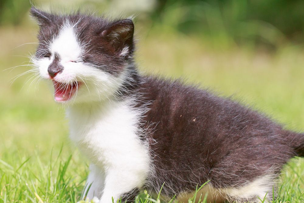 Een jong katje staat eenzaam miauwend op een grasveld en moet nog wennen aan het gras waar ze voor de eerste keer overheen loopt.