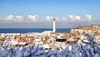 Die Sonne scheint auf den verschneiten Egmond mit seinem berühmten Leuchtturm. J.C.J der Speijk