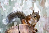 Ein Eichhörnchen erscheint plötzlich auf einem abgesägten Baumstamm in einem Park in Tokio, Japan.