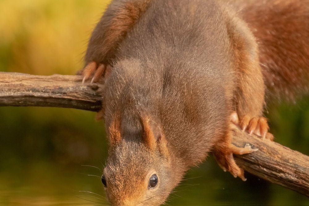 Das Eichhörnchen saß auf einem Ast über dem Wasser und begann zu trinken.