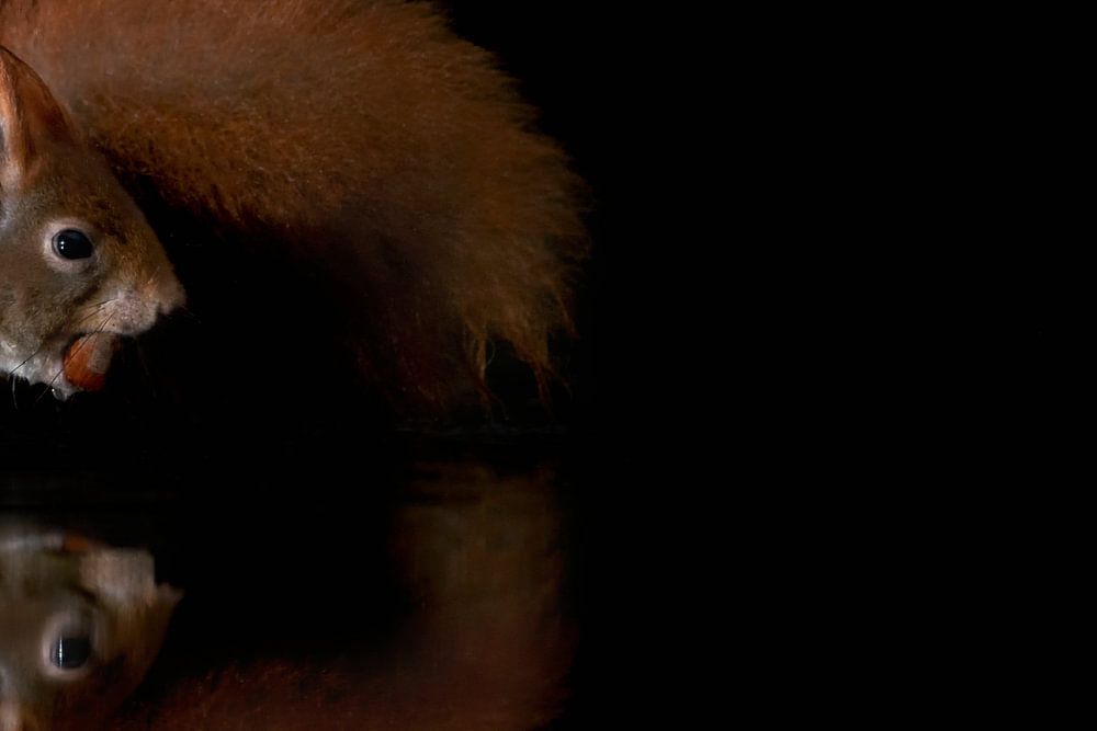Eichhörnchen, das im Wasser sitzt und eine Haselnuss frisst. Spiegelung im Wasser mit schwarzem Hintergrund.