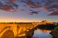 Ein Sonnenuntergang an der alten römischen Brücke (mit dem Fluss Guadalquivir) in Córdoba. Im Hintergrund die Große Moschee von Cordoba, besser bekannt als Mezquita. Córdoba liegt im Süden Spaniens, in der Region Andalusien.