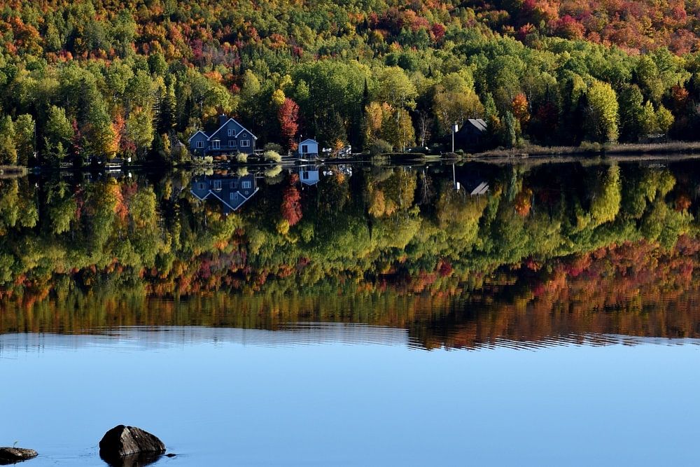 Ein Ahornwald am See im Herbst, Lac Frontière, Quebec, Kanada