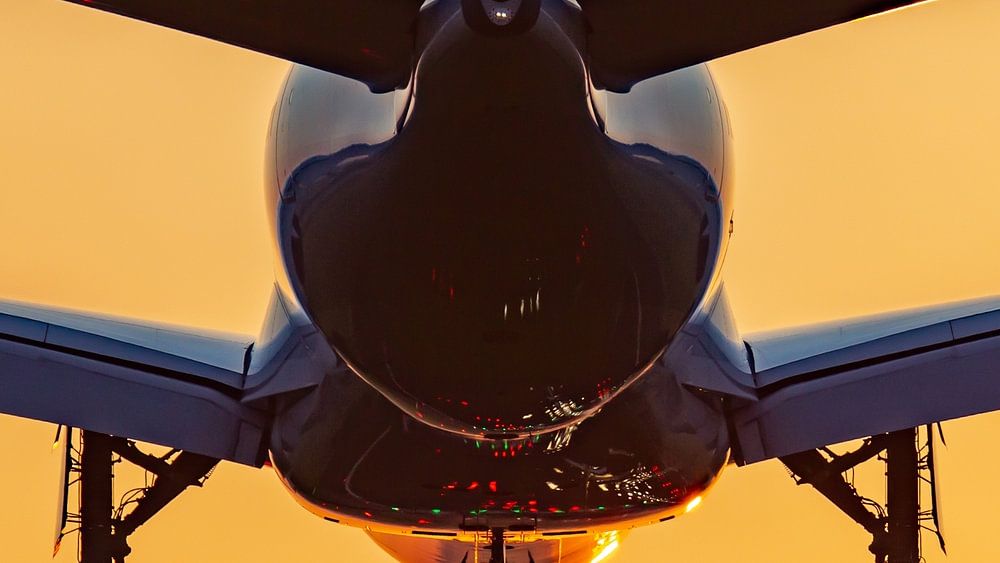 Eines der modernsten Flugzeuge ist der Airbus 350. Der Sonnenaufgang beleuchtet wunderschön die Unterseite des Flugzeugs. Das Flugzeug ist fast auf dem Flughafen Schiphol gelandet. Die Lichter der Landebahn spiegeln sich im Bauch des Flugzeugs.