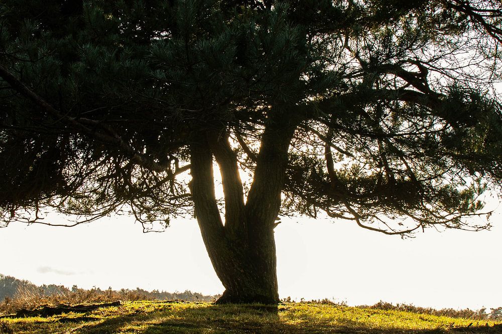 Hier ist ein Baum, der der Sonne im Weg steht und deshalb strahlt der Baum Licht aus.