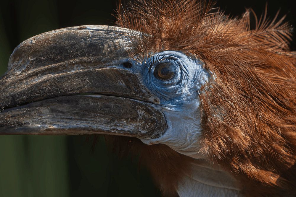 Diese atemberaubende Nahaufnahme zeigt den Schwarzhelm-Hornvogel (Bycanistes subcylindricus), einen einzigartigen und seltenen Vogel, der in den tropischen Regenwäldern Zentral- und Westafrikas lebt. Mit seinem beeindruckenden Schnabel, der markanten blauen Kehle und dem gesträubten Gefieder ist diese Art eines der faszinierendsten Mitglieder der Hornvogelfamilie.