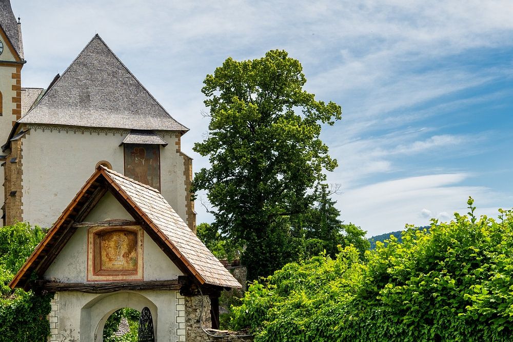 Ein Blick auf die Uferlandschaft und die Kirchen von Maria Wörth am Wörthersee