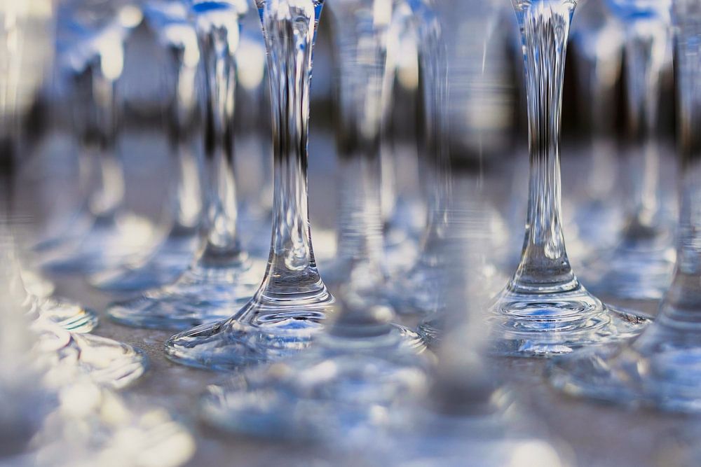 Hängende Gläser, fotografiert in einem Gastronomiebetrieb.