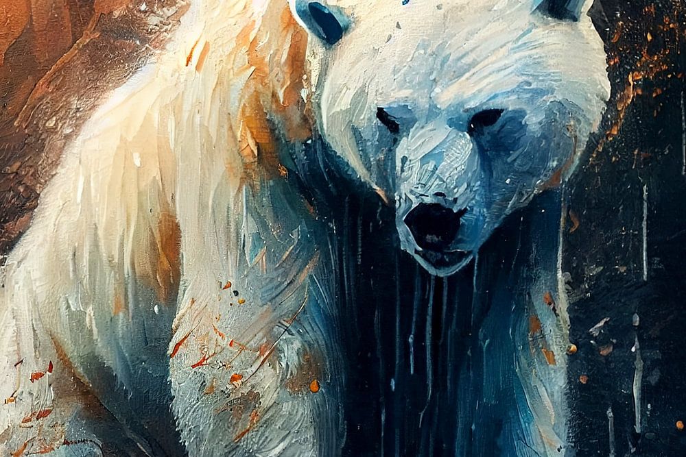 Ein digital gemaltes Porträt eines Eisbären, der aus dem Wasser auftaucht. Die Farbpalette und der rohe Stil dieses Werks sind von rostigem Metall inspiriert. Diese Farbpalette in Kombination mit den Farbspritzern sorgt für einen düsteren und geheimnisvollen Look. Das Werk verleiht Ihrem Interieur also einen modernen industriellen Look!