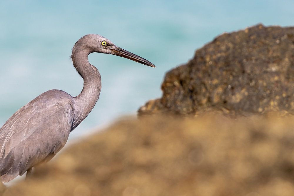 Dieser schöne, schwarz gefärbte Riffreiher verbrachte einige Zeit beim Fischen zwischen den Felsen vor mir. Das schöne blaue Meer im Hintergrund ist der Golf von Thailand.
