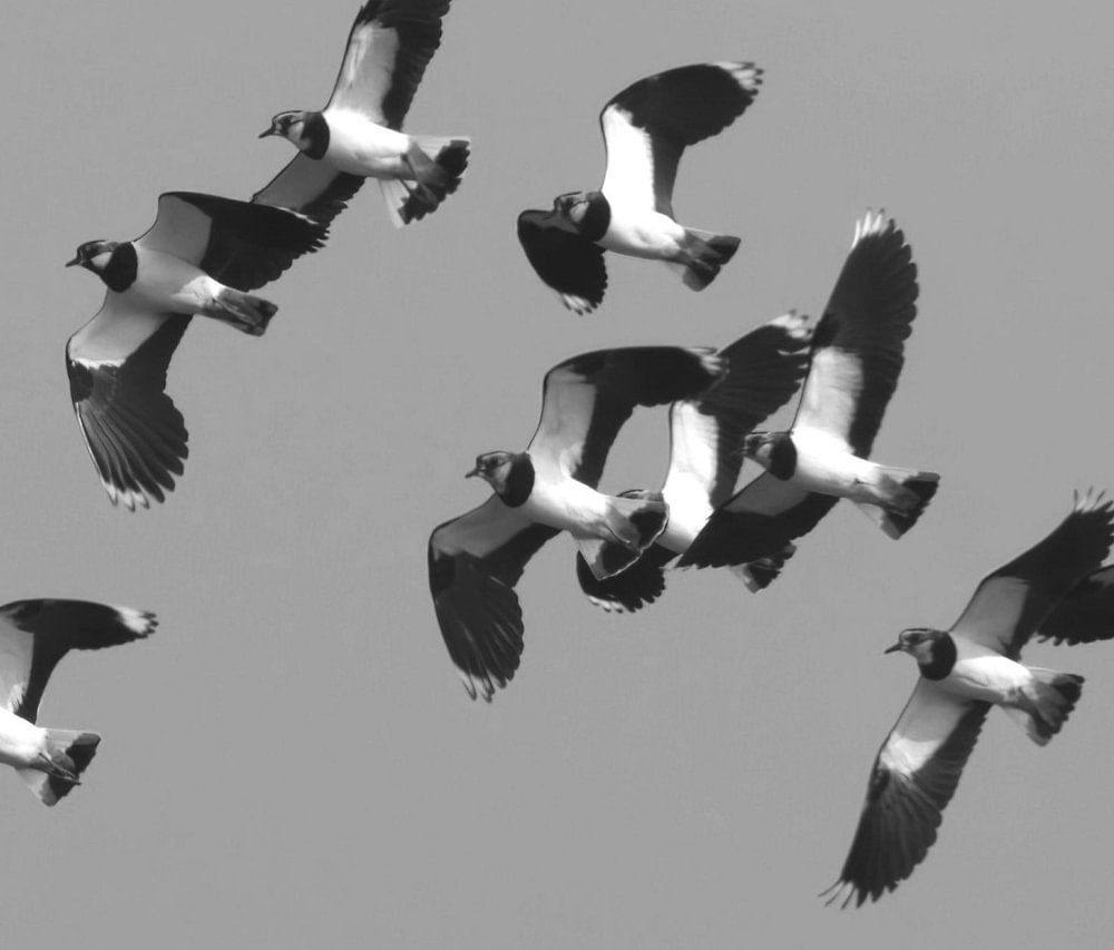 Wie schön dieser hier aussieht! Ein Flug des schönen Kiebitzes. Wir sehen sie häufiger einfach nur auf dem Feld oder am Wasser sitzen und im Schlamm nach Nahrung suchen, aber im Flug sind sie vielleicht noch schöner. Außerdem sind sie erstaunlich wendige Kunstflieger. Dieser Ausschnitt stammt von einem noch größeren Flug, bei dem sie, fast wie Stare, kreuz und quer durch die Luft flogen. Schwarzweiß wurde gewählt, weil es zu den Farben des Vogels selbst passt.