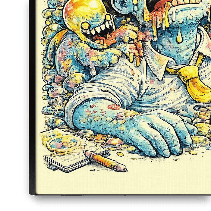 Ein Moment, in dem Inspiration überwältigend statt produktiv wird. Dieses Kunstwerk spiegelt geistige Übersättigung, Besessenheit und die Erschöpfung wider, die entsteht, wenn man zu viele Ideen gleichzeitig im Kopf hat. Verschmelzende Gedanken und überfüllte Formen suggerieren Kreativität, die sich selbst nährt.