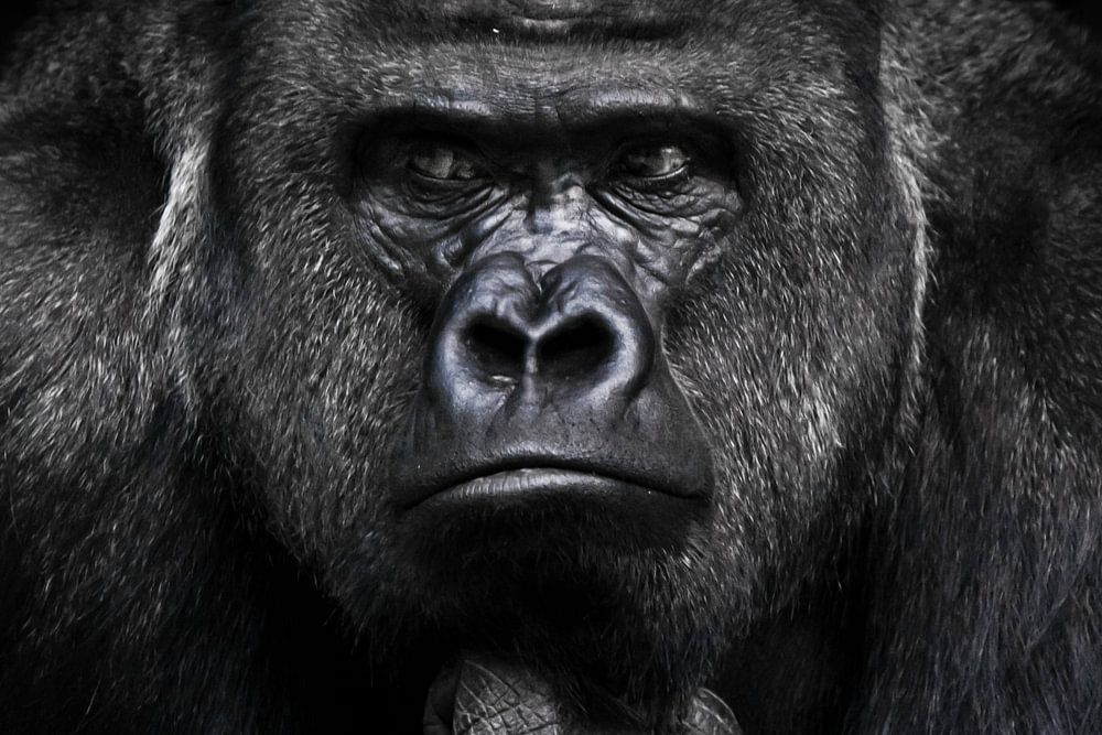 Ein Gorillamännchen mit kräftigen Schultern, breiten Schultern und missmutigem Blick blickt ruhig und abschätzend auf einen Gegner