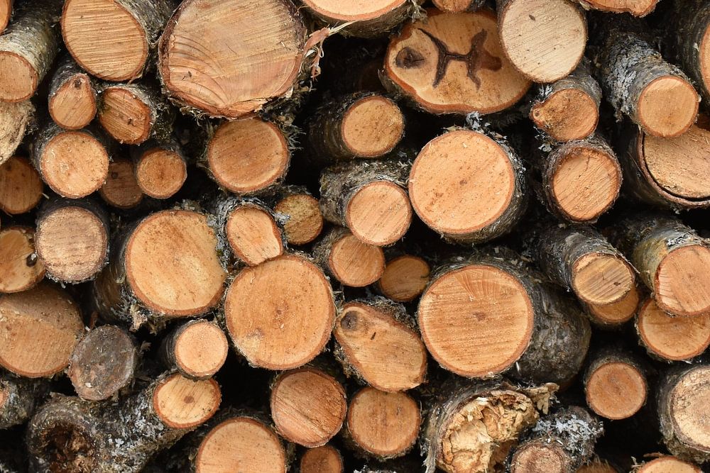 Ein Holzstapel am Waldrand, Sainte-Apolline, Quebec, Kanada