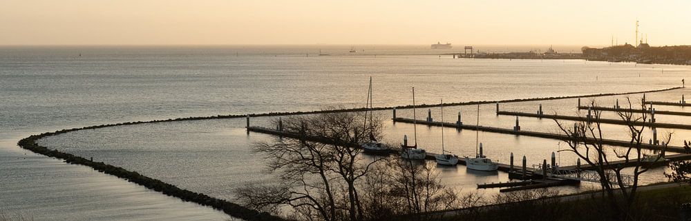 Ein Panorama des Hafens im Winter von West-Terschelling bei Sonnenuntergang.