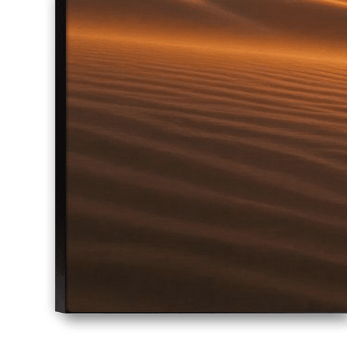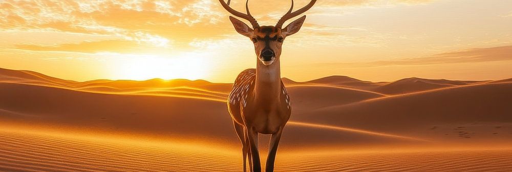 Ein einsamer Hirsch steht entschlossen in einer riesigen Wüste aus Sanddünen, mit einem warmen, feurigen Sonnenuntergang im Hintergrund. Die Schatten und das Licht, die auf den Sand fallen, vermitteln ein Gefühl von Geheimnis und Abenteuer, als ob dieses edle Tier der einzige Bewohner dieser goldenen Welt wäre. Dieses Bild mit seinen intensiven Farben und seiner heiteren Atmosphäre weckt Gefühle der Ruhe und Bewunderung für die Natur. Perfekt für Liebhaber dramatischer Landschaften und kraftvoller Tiersymbolik, eine perfekte Ergänzung für jeden Raum, in dem Natur und Eleganz aufeinandertreffen.