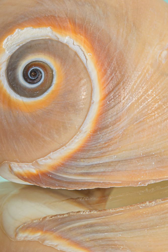 "Ein Schneckenhaus mit warmen Farben und türkisem Hintergrund" ist ein Makrofoto eines kleinen verlassenen Schneckenhauses, das auf einem gespiegelten Hintergrund liegt. Infolgedessen kann man auch das Schneckenhaus in der Grundfläche reflektiert sehen. Die Hintergrundfarbe verläuft von einer Ecke oben in einem hellen Türkis mit einem Farbverlauf bis zur anderen Ecke unten in einem etwas dunkleren Türkiston.