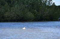 Ich habe dieses Foto im Harderbroek in der Gemeinde Zeewolde gemacht. Während des Fotos war ich in einer Vogelbeobachtungshütte. Der Schwan auf dem Foto befand sich in einem flachen Teil der Pfütze, so dass er mit den Beinen den Boden der Pfütze erreichen konnte.