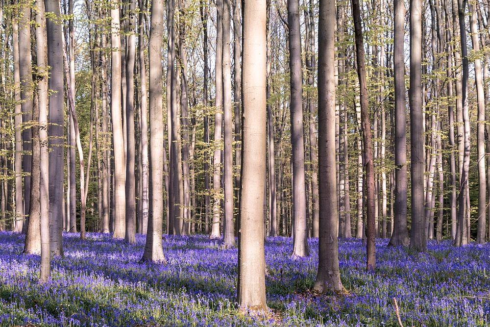 In der sanften Morgensonne breitet sich zwischen den schlanken, geraden Buchenstämmen ein endloser Teppich aus lila Waldhyazinthen aus. Das Licht fällt spielerisch zwischen die Bäume und zeichnet feine Schatten auf das Blütenmeer. Das frische Grün der jungen Blätter und die leuchtenden Farben verleihen dem Wald eine frische, fast märchenhafte Atmosphäre.