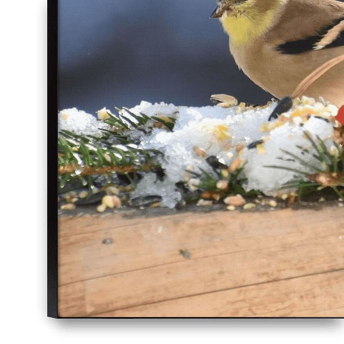 Bestelle dieses Vögel Wandbild Ein Stieglitz am Futterhäuschen im Garten von Claude Laprise als Reproduktion auf Leinwand, Alu-Dibond, als Poster, Fototapete, ArtFrame oder Acrylglasbild, maßgefertigt in höchster Qualität.