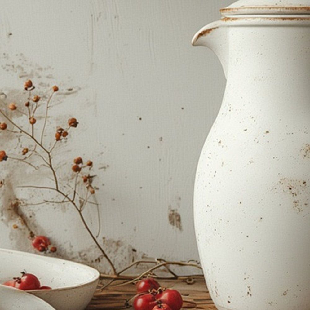 ein stillleben mit einem milchkännchen aus steingut, das auf einem alten, verwitterten holzbrett steht. daneben stehen weiß-beige schalen mit roten beeren und ein alter silberlöffel, der auf einem verwitterten, alten, weißen hintergrund liegt. anspielung auf den ländlichen stil, minimalismus.