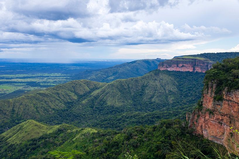 Ein weites Tal erstreckt sich bis über den Horizont und entfaltet sich in Schichten aus Grün und Licht. Die Weite der Landschaft vermittelt ein Gefühl stiller Kontinuität, in der die Entfernung die Details mildert und die Zeit stillzustehen scheint. Dieser Panoramablick spiegelt die Weite der Chapada dos Guimarães wider, wo der Raum…