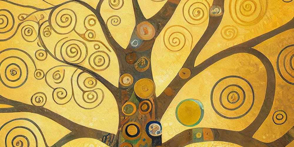Ein farbenfrohes digitales Gemälde namens "A Dream Like Tree" im Stil von Gustav Klimt. Dieses Werk ist von den Formen und der Farbpalette von "Der Kuss" inspiriert. Das Werk verleiht Ihrem Interieur einen warmen und klassischen Look!