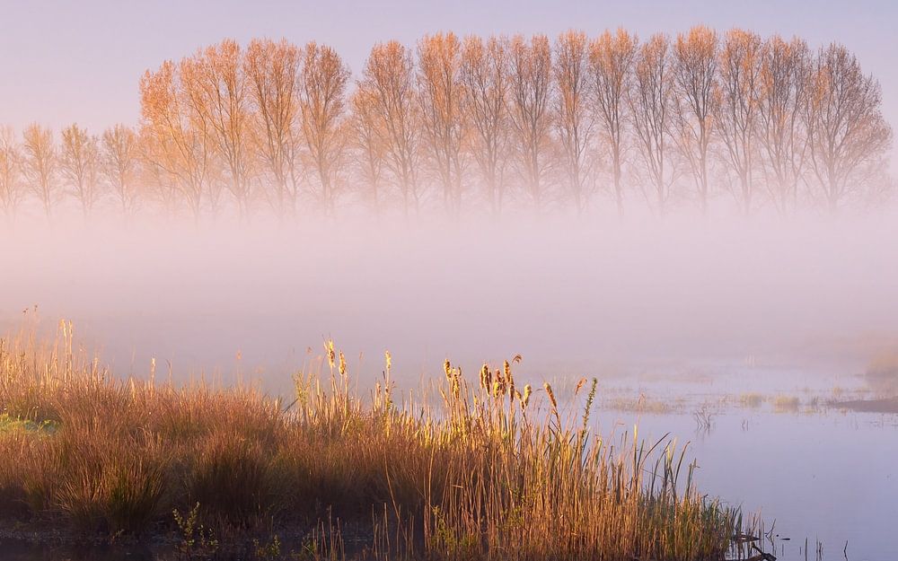 Diese Bäume stehen im Wasser des wunderschönen Natur- und Sumpfgebietes Tusschenwater. Dieses Gebiet befindet sich zwischen Hoogezand und Zuidlaren in der Nähe des Zuidlaardermeeres im Hunzedal. Etwa 2019 wird dieses Gebiet offiziell eröffnet werden. Es handelt sich um ein Wassergewinnungs- und Wasserspeichergebiet, aber auch um ein Gebiet, in dem viele Vogelarten wie Säbelschnäbler, Gänse, Enten und Watvögel ein neues Futtergebiet gefunden haben, aber auch Biber und Otter sind hier anzutreffen. Es ist ein Paradies für Vögel. Es ist ein Feuchtgebiet, in dem es das ganze Jahr über Wasser gibt, im Winter füllt es sich und in den Sommermonaten wird es weniger Wasser haben. Sie finden hier auch schöne Wanderwege auf unbefestigten Wegen, gepflasterten Straßen und Kais. Das Gebiet wird von der Stichting Het Drentse Landschap verwaltet. Das Foto habe ich an einem Morgen mit einem schönen und stimmungsvollen Sonnenaufgang aufgenommen.