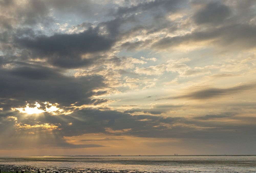 Dieses Foto zeigt einen weiten Blick auf das Wattenmeer, aufgenommen bei Sonnenuntergang. Der Himmel ist das auffälligste Element, mit einer dramatischen und vielschichtigen Wolkenformation, die den größten Teil des Bildes einnimmt. Die Sonne, die knapp über dem Horizont steht, bricht durch die Wolken und wirft Lichtstrahlen, die sich über die Landschaft verteilen. So entsteht eine Palette aus warmen, goldenen Farbtönen, die in Grau- und Blautöne übergehen.