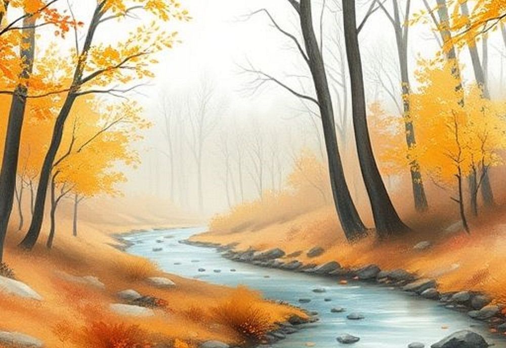 Dieser atemberaubende Digitaldruck fängt die ruhige Schönheit eines Herbstwaldes in seiner ganzen Pracht ein. Ein sanfter Bach schlängelt sich durch ein friedliches Waldgebiet, sein kristallklares Wasser spiegelt die leuchtenden Farben der Jahreszeit wider. Die Ufer sind mit einem Teppich aus herabgefallenen Blättern in Orangetönen, feurigem Rot und sonnigem Gelb geschmückt, während die anmutigen Äste der Bäume in der Luft in goldenem Laub erstrahlen. Die Luft ist neblig und weich und schafft eine ruhige und ätherische Atmosphäre. Glatte Flusssteine sind auf der Wasseroberfläche verteilt, und verstreute Blätter treiben sanft flussabwärts und verleihen der Szene einen Hauch von Laune und Bewegung. Dieses Kunstwerk ist eine perfekte Darstellung der beruhigenden Kraft der Natur und der atemberaubenden Schönheit des Herbstes und damit eine ideale Ergänzung für jeden Raum, der einen Hauch von Frieden und lebendigen Farben sucht.