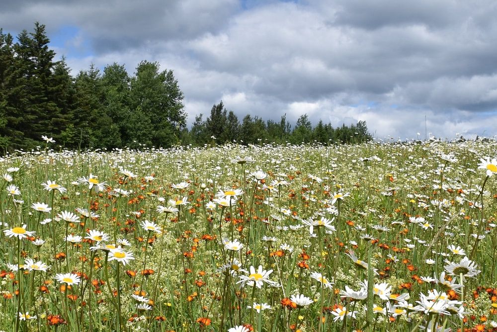 Ein blühendes Feld unter einem Sommerhimmel, Sainte-Apolline, Quebec, Kanada