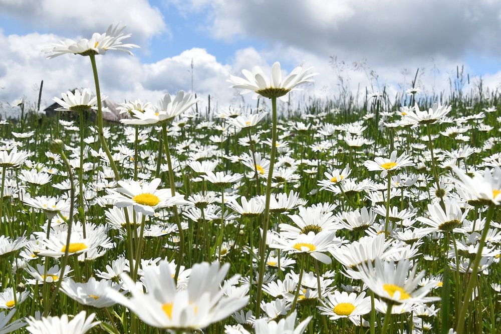 Ein blühendes Feld mit Gänseblümchen, Sainte-Apolline, Quebec, Kanada