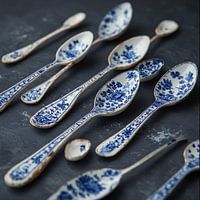 eine Reihe von Delfter Blau Löffel Porzellan, Steingut liegen auf einem dunklen schwarzblauem Hintergrund. Beschriftet von Delfter Blau, alte niederländische Meister neuen Stil Kunst.