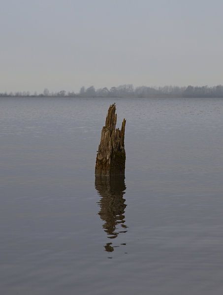 Ein einsamer, zerbrochener Wellenbrecher in den Nieuwkoopse Plassen. Da es sich um einen einzelnen (zerbrochenen) Pfahl handelt, vermittelt er ein ruhiges Bild.