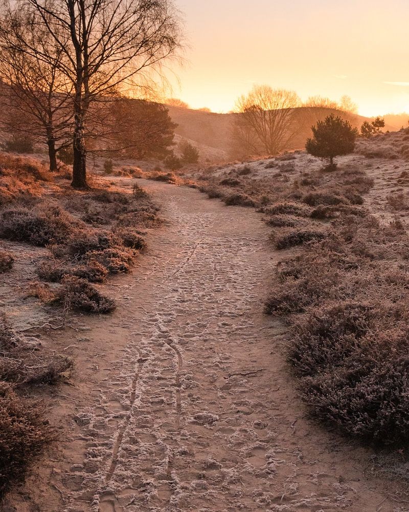 Der Wanderweg durch die winterlich gefrorene Landschaft führt über die Birke am Wegesrand zur aufgehenden Sonne, die sich knapp über dem Hügel erhebt.