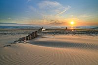 Verliebte beobachten den Sonnenuntergang an der nordholländischen Küste mit aneinandergereihten Masten