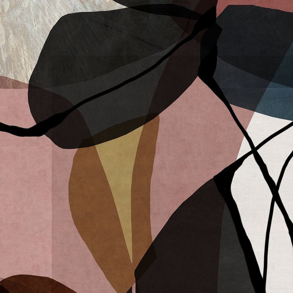 Abstrakt minimalistisches Kunstwerk mit geometrischen Formen, modulierten Linien und Farbtönen in dunkelgrau, pink und braun.