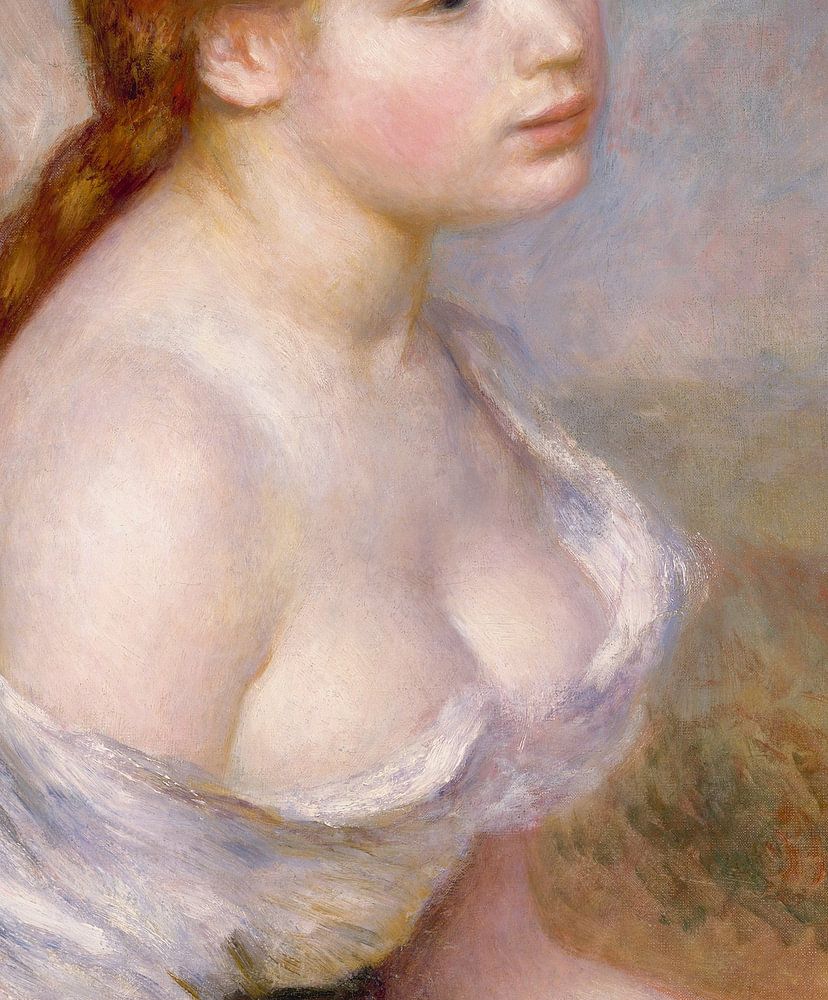 Ich habe wieder aufgenommen, nie im Stich lassen zu, meinen alten Stil, weich und leicht von Touch ‚, kündigte Renoir an seine Händler Durand-Ruel in 1888. Dieses Bild machte im folgenden Jahr, ein Beispiel für die Vorliebe des Künstlers für ebenso sanft und lyrisch Fächer. Podien und andere Wildblumen verleihen eine Notiz aus rustikalen Charme des süßen Gesicht Modell. Solche Feiern der Jugend und Schönheit bewiesen mit Kundschaft Renoirs sehr erfolgreich zu sein.
