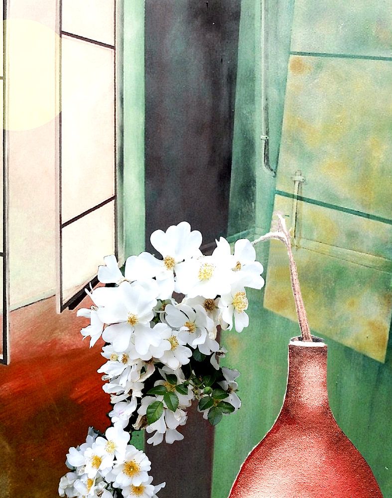 Fotografie und Malerei digital zusammengeführt. Architektur, Raum, Fenster, Vase, Blumen, Florales.