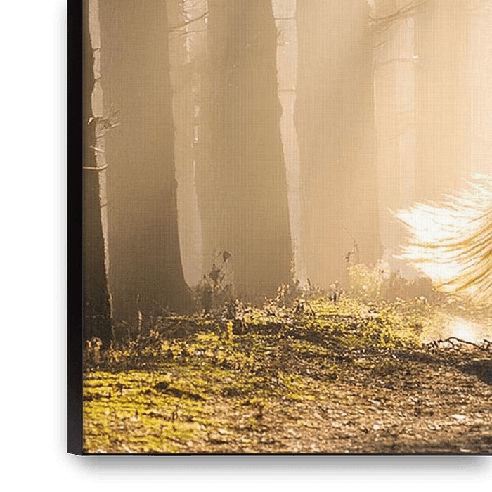 Einhorn; magisch; Pferd; Biest; Tier; Sonnenaufgang; sonniger Wald; Bäume; Märchen; Kinder; mythisch; Mythologie; läuft