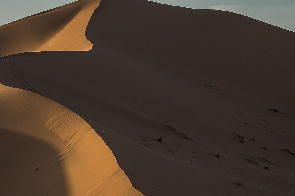 Während die Sonne langsam über den Dünen aufgeht und die Welt von Minute zu Minute wärmer wird, wird die Welt ein bisschen wärmer. Die Dünen von Erg Chebbi in Marokko sind ein schönes Beispiel für typische Sanddünen, in denen man endlos wandern und sich leicht verirren kann. Durch die Dünen zu wandern und nach den schönsten Linien während des Sonnenaufgangs zu suchen, war ein besonderes Erlebnis. Leider konnten wir nur einen Tag dort bleiben, aber sonst hätte ich diese Szene gerne immer wieder eingefangen. Der Minimalismus, die klaren Linien und die feinen Details machen diese Erg-Dünen so berühmt.