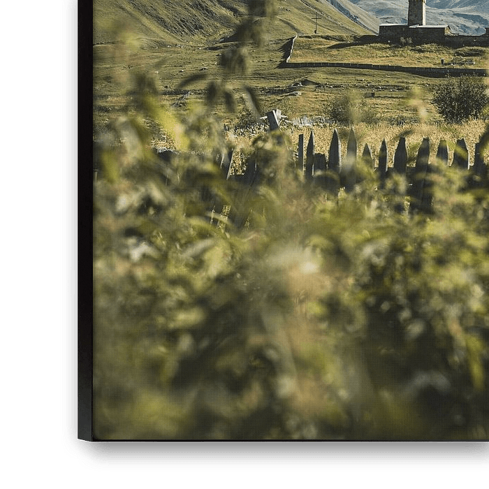 Schöner Druck für die Wand, der Ruhe ausstrahlt. Ein typischer Turm in der Region Svaneti, Georgien, mit dem Kaukasusgebirge im Hintergrund. Ein wunderschönes Bild zum Wegträumen oder um Ruhe in einen geschäftigen Konferenzraum zu bringen.